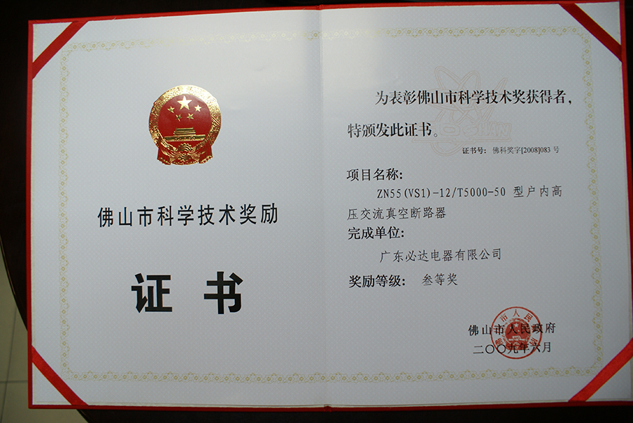 4.ZN55(VS1)-12T5000-50型户内高压交流真空断路器获佛山市科学技术三等奖2009.6